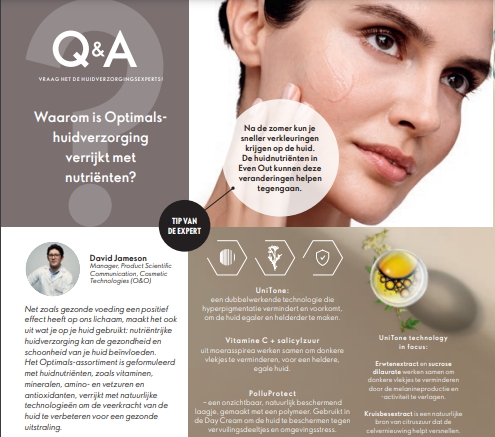 Optimals Even Out is ontwikkelt door huidvoeding experts en vermindert hyperpigmentatie, zoals donkere vlekjes – voor een egale en stralende huid!