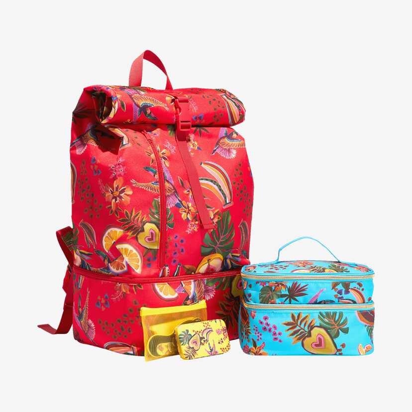 Kleurrijke toilettas met zomers patroon. Bevat twee ruime vakken, binnenzakjes en kwastenhouders. De perfecte tas om je make-up en toiletartikelen in op te bergen en mee te nemen.