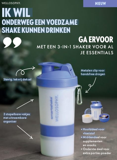 Onze vernieuwde en innovatieve Wellosophy Smartshake Bottle is makkelijk uit elkaar te halen, opstapelbaar en ideaal om je essentials overal mee naartoe te nemen. Poeder mengen wordt makkelijker dan ooit dankzij het organiseerbakje, een uitneembare mixer en een lekvrij deksel. Vaatwasser-, diepvries- en magnetronbestendig.