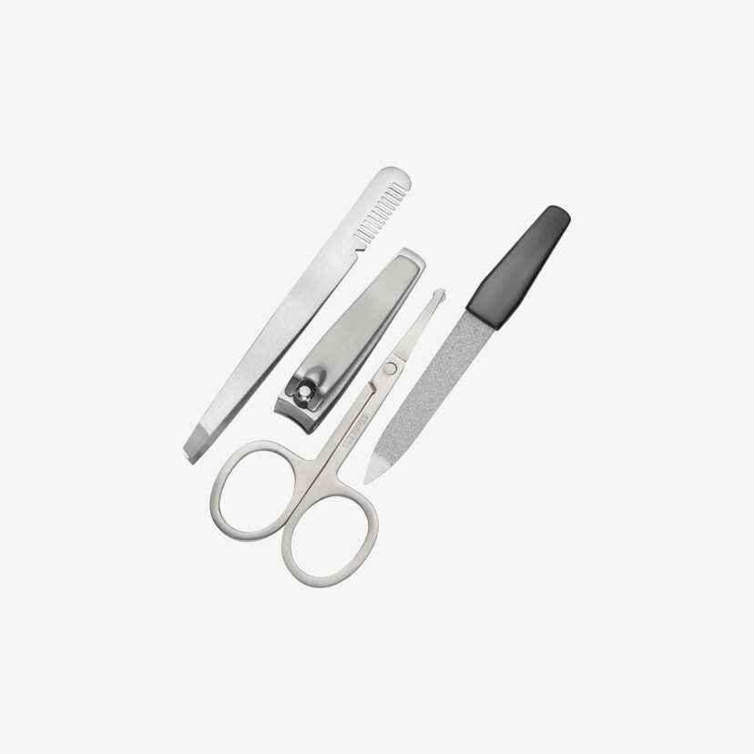 Set van vier on-the-go grooming tools voor het netjes houden van gezichtshaar en nagels. Alle tools zijn gemaakt van duurzaam roestvrijstaal en verpakt in een mooie kunstlederen etui.