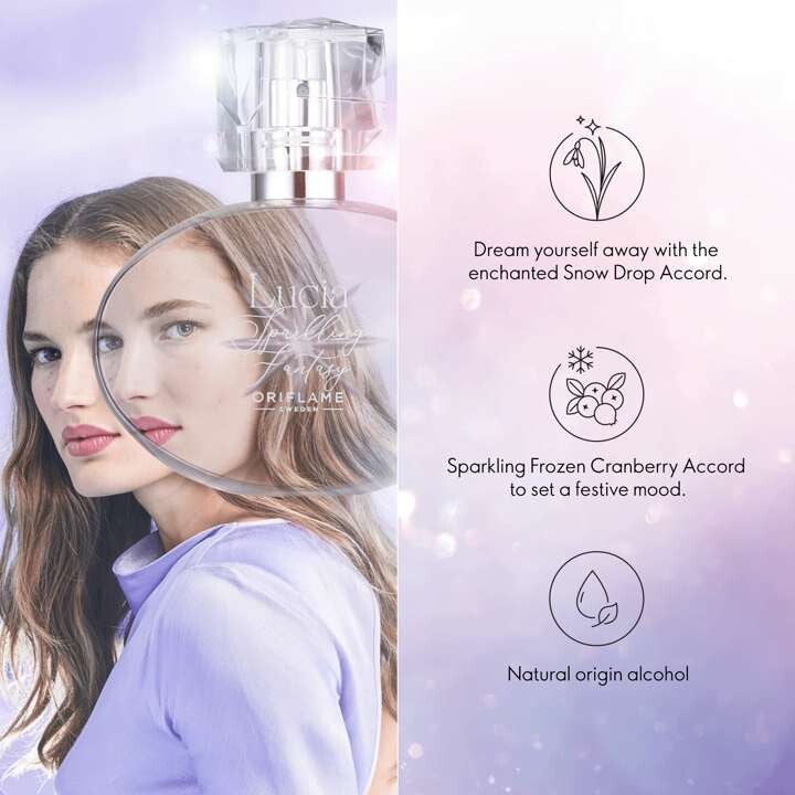 Lucia Sparkling Fantasy Eau de Toilette is gecreëerd rondom een betoverend, teder sneeuwdruppelakkoord en een ijzige twinkeling van bevroren cranberry-akkoord.