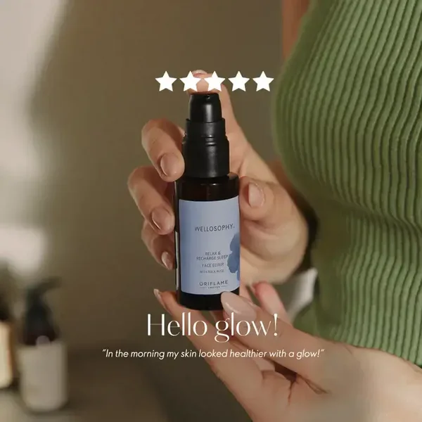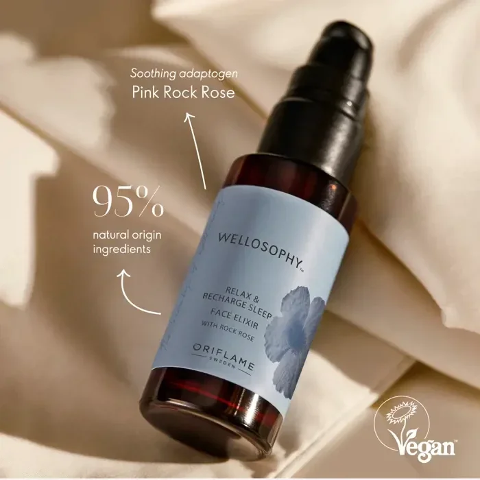 Wellosophy Relax & Recharge Sleep Face Elixir verrijkt je avondritueel met een ontspannende huidverzorgingservaring. De vegan formule met 95% natuurlijke ingrediënten is geschikt voor alle huidtypes, inclusief de gevoelige huid.