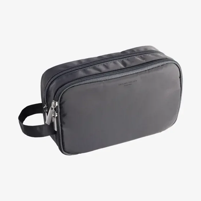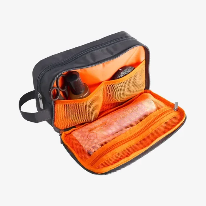 Slimme toilettas in een sportieve grijze kleur met een oranje voering en een praktische band, organiseervakken van meshstof en een ritsvak van meshstof.