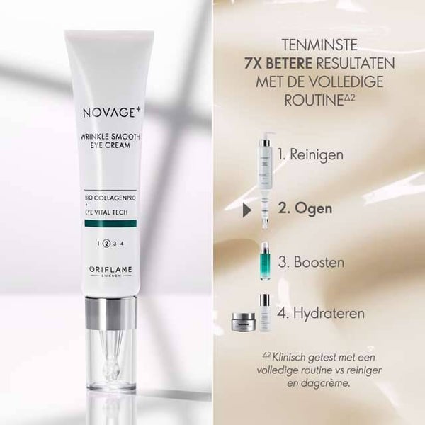 Novage+ Wrinkle Smooth Eye Cream bestrijdt fijne lijntjes en rimpels (inclusief kraaienpootjes), en vermindert zichtbaar tekenen van vermoeidheid, wallen en donkere kringen zodat de huid rondom de ogen verfrist en verlicht aanvoelt.